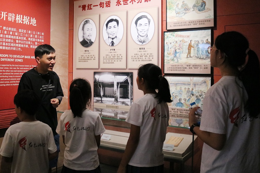 孩子们在庄严肃穆的浙西南革命根据地纪念馆(旧址)中,聆听烽火岁月的故事,触摸历史温度,革命先辈的英勇无畏化作颗颗红星,点亮了心中的爱国火种。