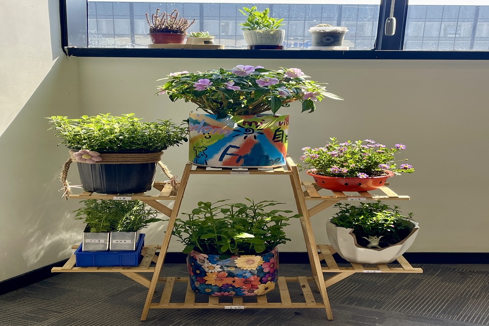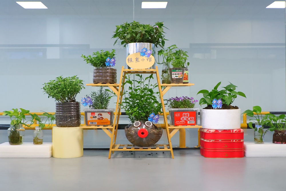 PRJ部门专属小花坊——“植愈小馆”,以工艺之名,赋予废弃品新生。在这里,食品包装盒、塑料瓶、泡沫箱等被赋予了新的生命,化作一个个再生花盆。钧宝的精美手工画装饰其上,犹如点睛之笔,为花盆增添了一抹文化韵味,每一盆都是对工艺与环保的完美融合。“植愈小馆”不仅是部门绿色文化的缩影,更是我们传递“变废为宝,循环再生”理念的生动实践。在这里,废弃不再是负担,而是创意与绿色的源泉,每一盆绿植都在诉说着“再生”的故事。