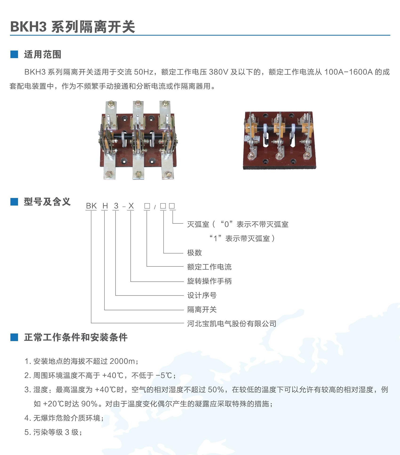 BKH3系列隔离开关适用于交流50Hz,额定工作电压380V及以下,额定工作电流100A-1600A的成套配电装置中,作为不频繁手动接通和分断电流或作隔离器用。BKH3系列隔离开关符合GB/T 14048.3《低压开关设备和控制设备低压开关、隔离器、隔离开关及熔断器组合电器》。